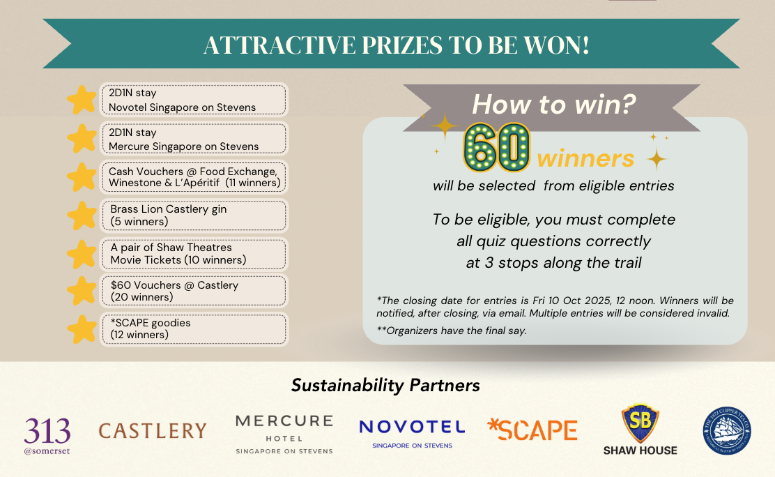 While the contest is now closed, you're welcome to continue exploring the 'Sustainability By Design' Trail and supporting ESG initiatives along Orchard Road.
